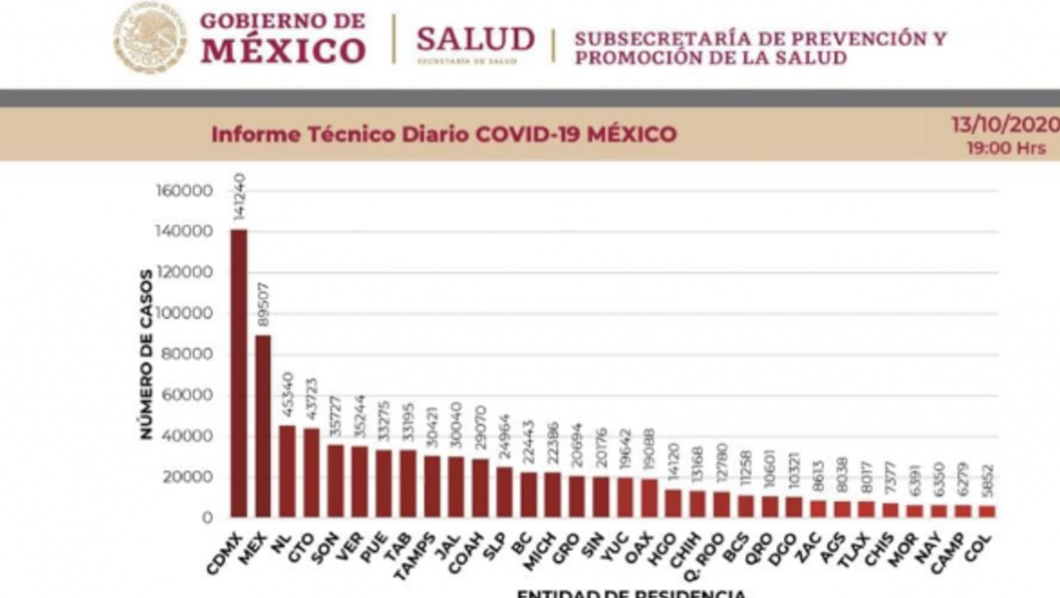 México acumuló, al corte de este 13 de octubre, 84 mil 420 muertes por COVID-19, con 37 mil 463 casos de contagios confirmados de coronavirus, según informaron autoridades de la Secretaría de Salud (Ssa).