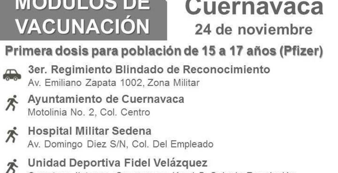 La Brigada Correcaminos en Morelos informa que este miércoles 24 de noviembre continuará en Cuernavaca la aplicación de primeras dosis de Pfizer contra COVID-19 para los adolescentes de 15 a 17 años en los puntos ya establecidos; además, se habilitará el Tercer Regimiento Blindado de Reconocimiento como sede de vacunación en la capital del estado.
