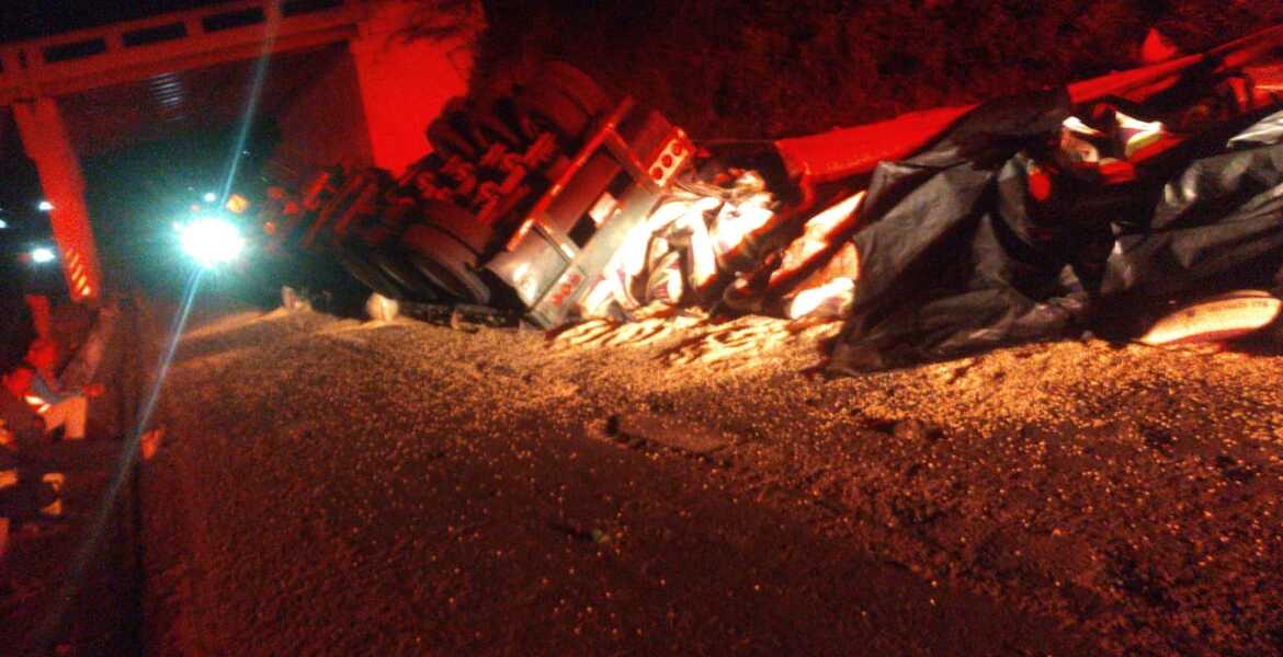 Atravesado sobre el kilómetro 10+800 de la autopista Cuernavaca-Iguala, acabó un camión cargado con bultos de maíz, tras volcar luego de que su conductor se quedara dormido al volante y volcara a la altura de la colonia Centro, de Amacuzac.