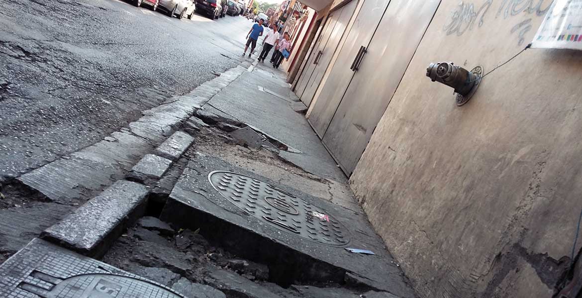 En deplorable estado se encuentra este tramo de la banqueta en la calle Rayón, del Centro de Cuernavaca, lo cual significa un peligro de caer para cualquier transeúnte que camine distraído.