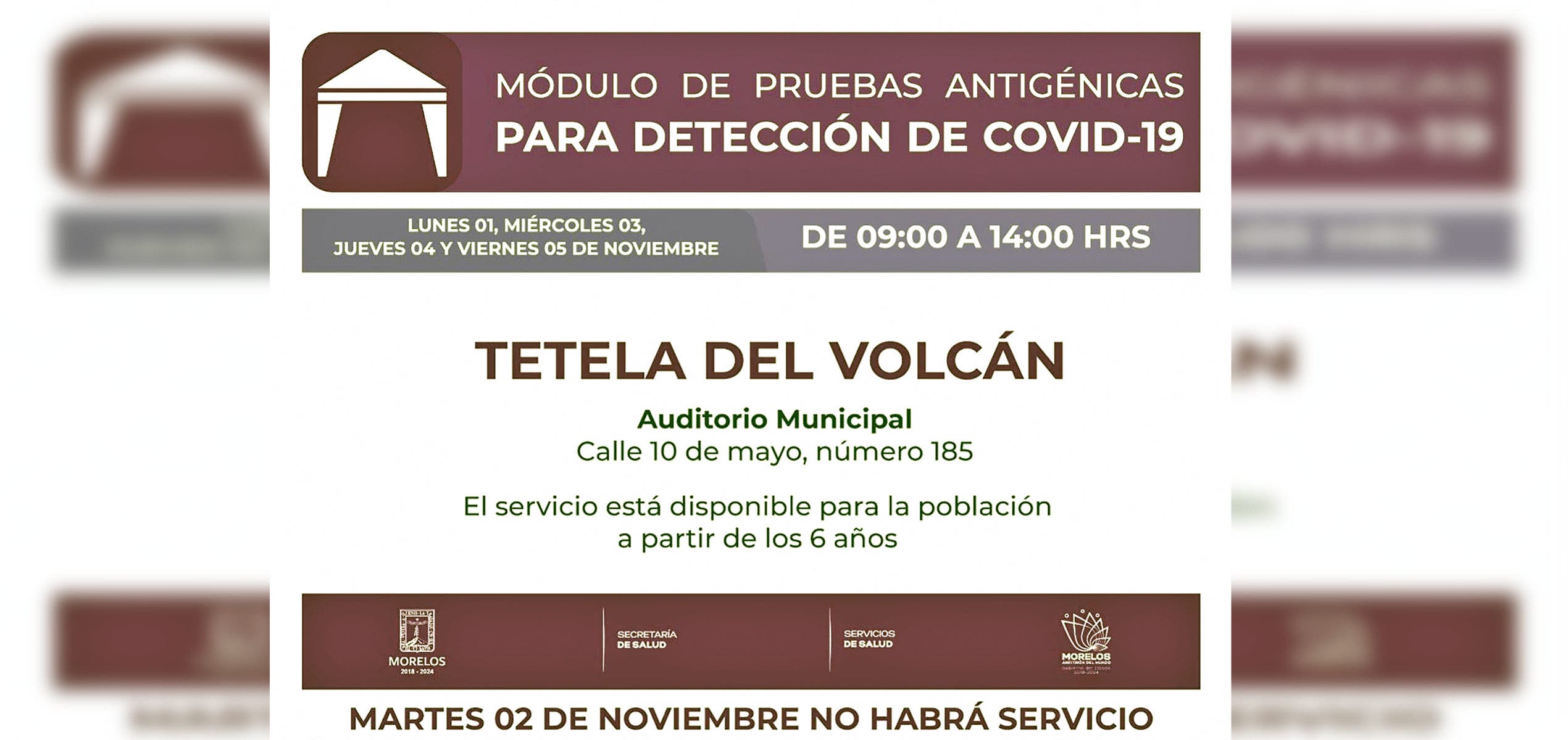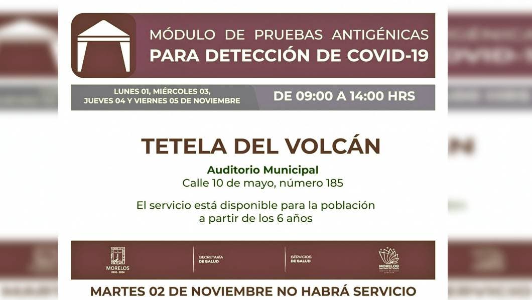 Tetela del volcán.- Servicios de Salud de Morelos (SSM) anunció que el módulo de pruebas antigénicas para menores de cero a cinco años y población en general se instalará en el auditorio municipal, calle 10 de mayo, número 185 en el municipio de Tetela del Volcán, el cual brindará servicio gratuito hoy lunes 01, miércoles 03, jueves 04 y viernes 05 de noviembre.