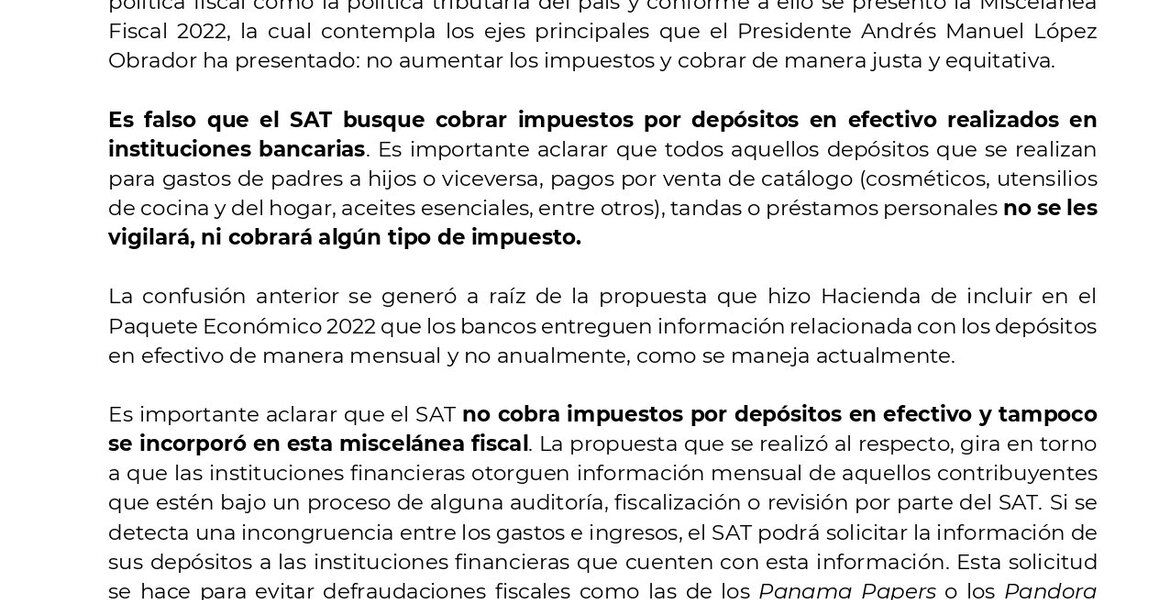 “Es importante aclarar que el SAT no cobra impuestos por depósitos en efectivo y tampoco se incorporó en esta miscelánea fiscal. La propuesta que se realizó al respecto, gira en torno a que las instituciones financieras otorguen información mensual de aquellos contribuyentes que estén bajo un proceso de alguna auditoría, fiscalización o revisión”, por parte de la institución.