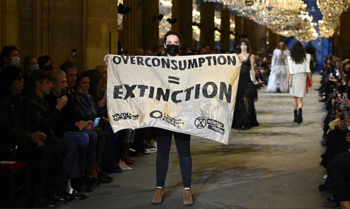 Activistas denunciaron durante la pasarela el impacto que tiene la industria de la moda en el cambio climático, pues haciéndose pasar por modelos y participar en el desfile, a mitad de su camino sacarían de su ropa enormes lonas con frases como "sobre consumo es igual a extinción".