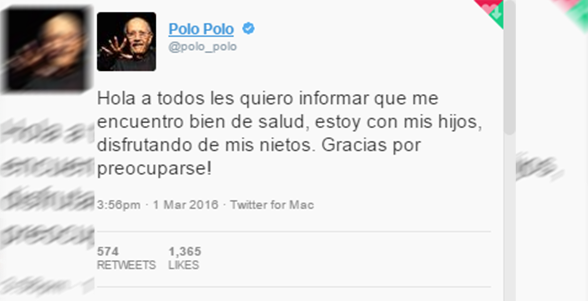 Polo Polo no está desaparecido ni secuestrado o al menos eso indicó a través de su cuenta en Twitter, luego de que su esposa Martha Zendejas emitiera escandalosas declaraciones a la revista TV Notas.
