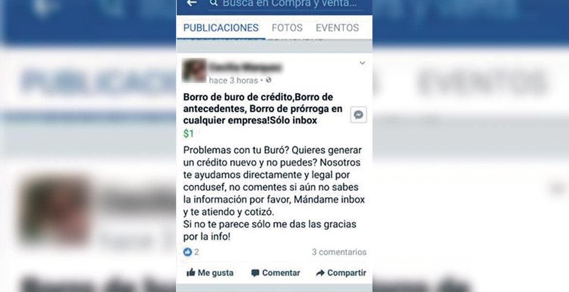 La Comisión Nacional para la Protección y Defensa de los usuarios de Servicios Financieros (Condusef) alerta a la población por personas que ofrecen, a través de la red social Facebook, eliminar sus antecedentes del historial crediticio.