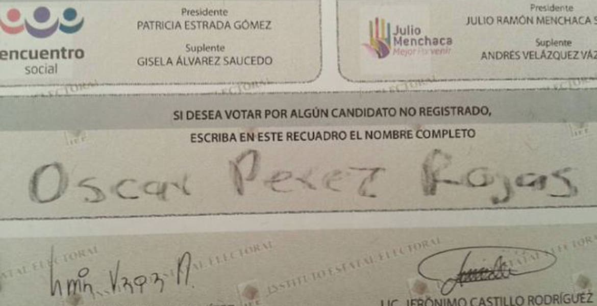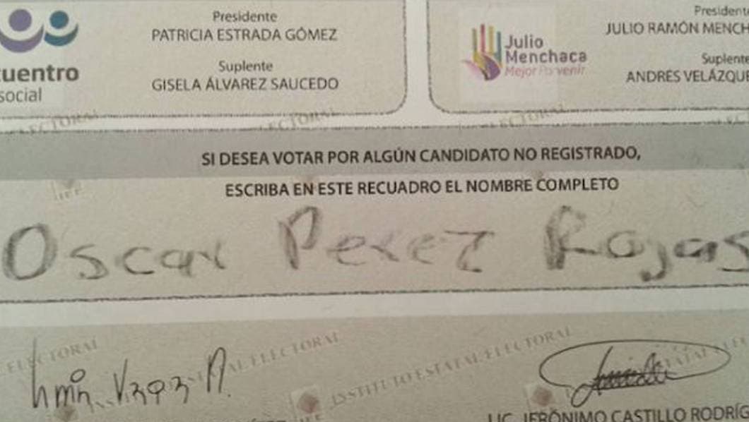 En la boleta está la opción de poner el nombre de alguna persona aunque no está registrado como candidato y Velázquez escribió en ese espacio Óscar Pérez Rojas