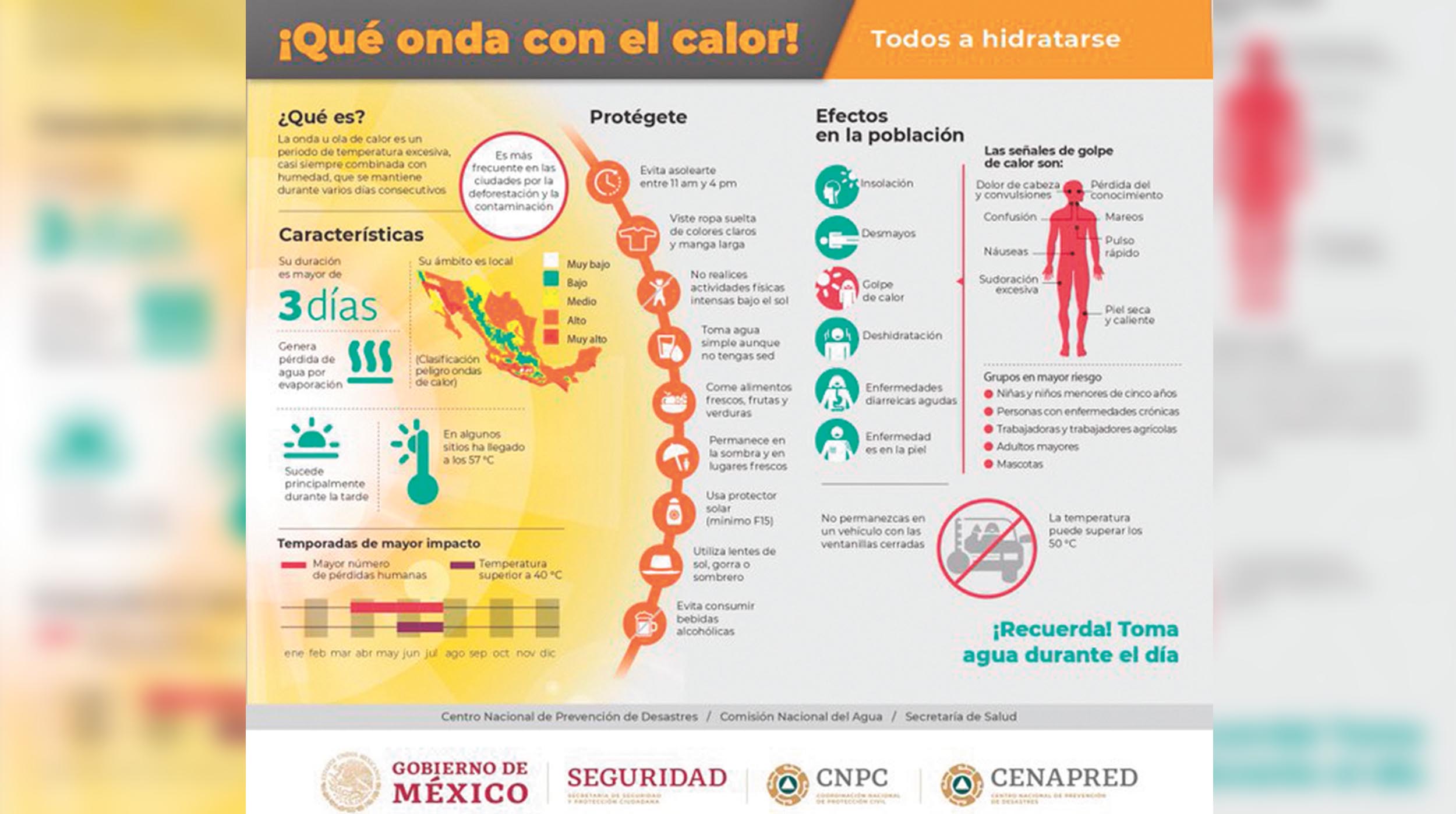 La Secretaría de Salud pidió a la población seguir recomendaciones como mantenerse hidratado a través del consumo de abundante agua; utilizar protector solar en cara y cuerpo; evitar exponerse de manera directa al sol de las 11:00 a las 16:00 horas; utilizar gorra, sombrero o sombrilla y ropa de colores claros.