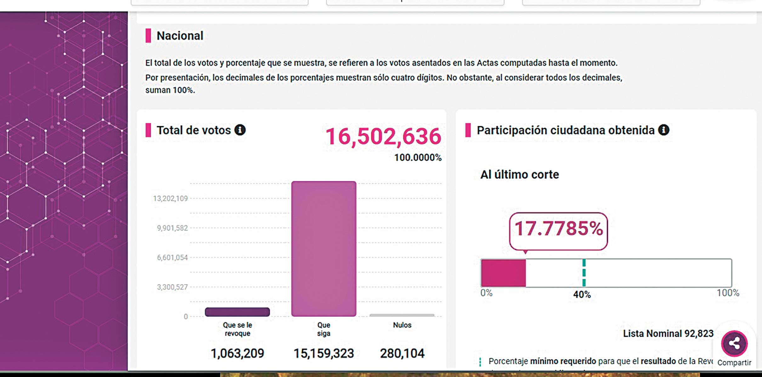 De las personas que participaron en la consulta sobre la Revocación de Mandato el 93.30% votó a favor de que AMLO siga al frente de la presidencia de la república y el 5.50% a favor de revocarle el mandato.
