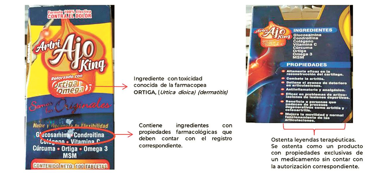 Cuernavaca, MORELOS.- Cofepris alerta sobre la comercialización ilegal del producto “Artri Ajo King reforzado con Ortiga Omega 3”, el cual no cuenta con la autorización correspondiente a un medicamento ni presenta la denominación de suplemento alimenticio.