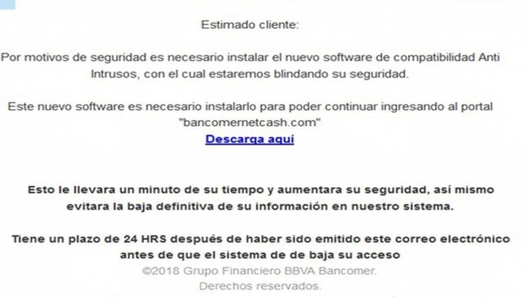 “Tiene un plazo de 24 horas después de haberse emitido este correo electrónico antes de que el sistema dé de baja su acceso”, se lee en el supuesto mensaje de Bancomer.