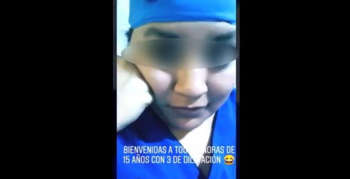 En el video se percibe a la joven practicante riéndose, mientras la paciente grita de dolor. Un mensaje acompaña las fotos: “Bienvenidas a todas las señoras de 15 años con 3 de dilatación”.
