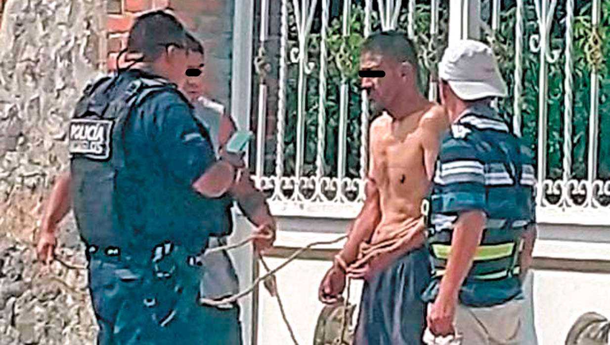Un grupo de vecinos se acercó a la casa para asegurar al presunto delincuente, el cual aparentemente pretendía robar objetos, por lo que lo amarraron con un lazo y le pegaron en el pecho una cartulina con un texto que decía: “esto me pasó por ratero”.