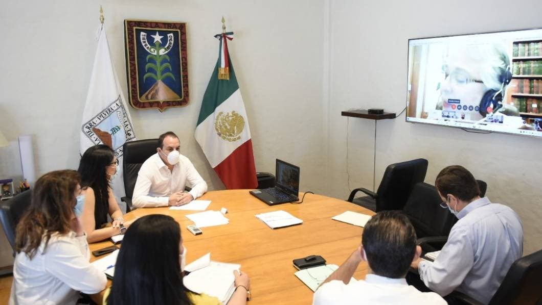 En la videoconferencia, el jefe del Ejecutivo en Morelos estuvo acompañado por Marco Antonio Cantú Cuevas, Ana Cecilia Rodríguez González, Margarita Saravia González, Alejandro Villarreal Gasca y Mirna Zavala Zuñiga, titulares de las secretarías de Salud, Desarrollo Económico y del Trabajo, Turismo y Cultura, Hacienda, así como de Administración.