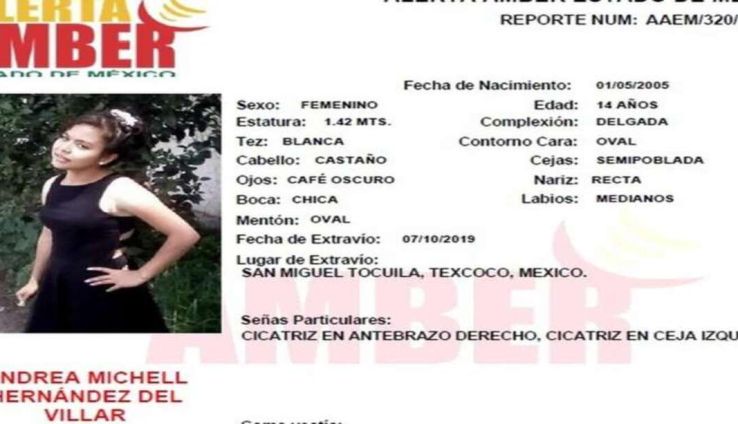 Andrea Michell Hernández del Villar, de 14 años desapareció el pasado 7 de octubre en el poblado de San Miguel Tocuila, en Texcoco, Estado de México.