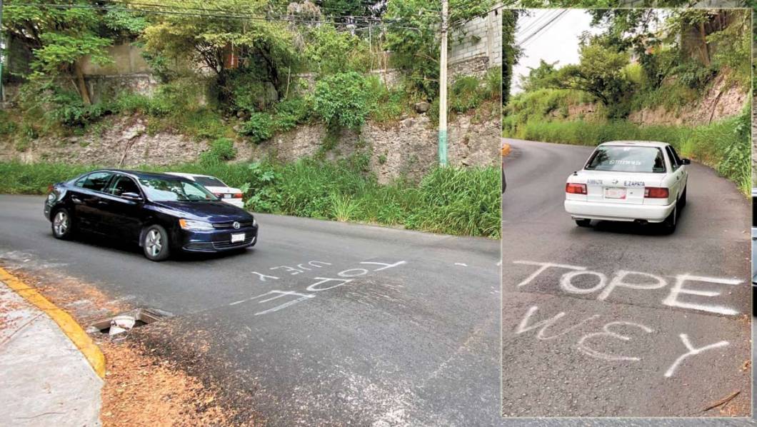 Cuernavaca.- Debido a la falta de una adecuada señalización por parte del Ayuntamiento de Cuernavaca, vecinos de la avenida Palmira tuvieron que pintar con aerosol la leyenda “TOPE WEY”, para advertir a los automovilistas sobre un tope que fue colocado en la esquina de la calle Apatzingán, justo a espaldas del internado Palmira.