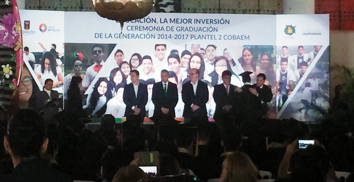 Durante la ceremonia de graduación de la generación 2014-2017 del Plantel 02 de Cobaem, el mandatario estatal celebró el esfuerzo de los jóvenes egresados, 489 en total, 227 en el turno matutino y 212 en el vespertino, pero también hizo el reconocimiento a los padres de familia, quienes están atentos al crecimiento de sus hijos,