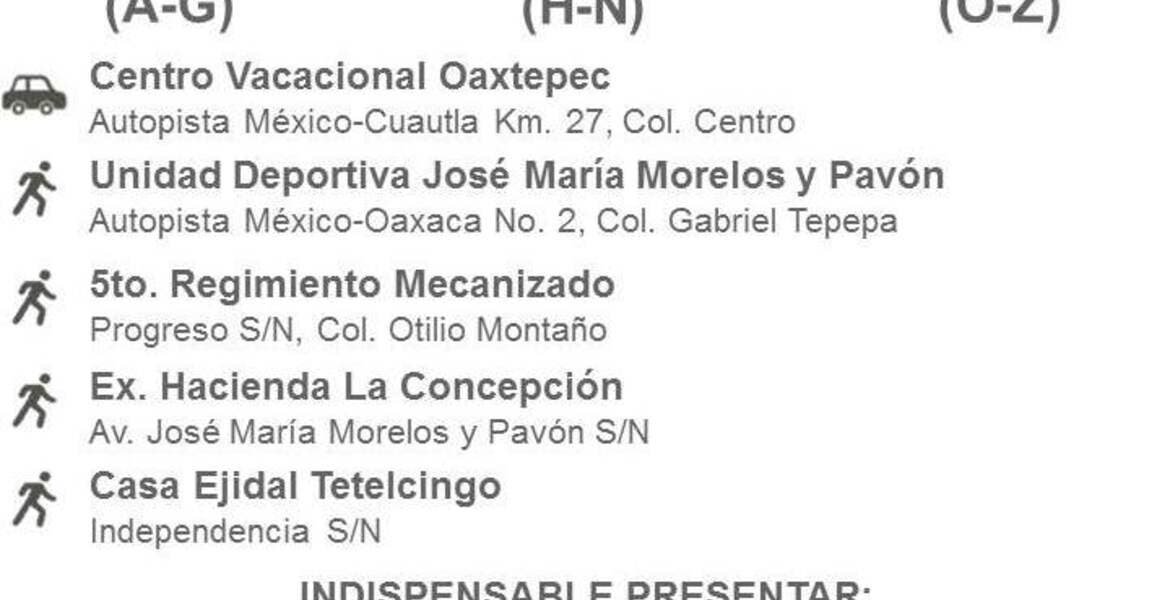 La Brigada Correcaminos que integra la Secretaría de la Defensa Nacional (SEDENA), la Guardia Nacional (GN), la Secretaría de Bienestar, la Secretaría de Salud del estado de Morelos, el Instituto Mexicano del Seguro Social (IMSS) y el Instituto de Seguridad y Servicios Sociales de los Trabajadores del Estado (ISSSTE), informa que es necesario que las personas entre 50 y 59 años de edad presenten la hoja de la primera aplicación de la vacuna, así como una identificación oficial; además, deberán mostrar un comprobante de domicilio para verificar que son residentes de Cuautla, del formato del expediente de vacunación, como requisitos indispensables.