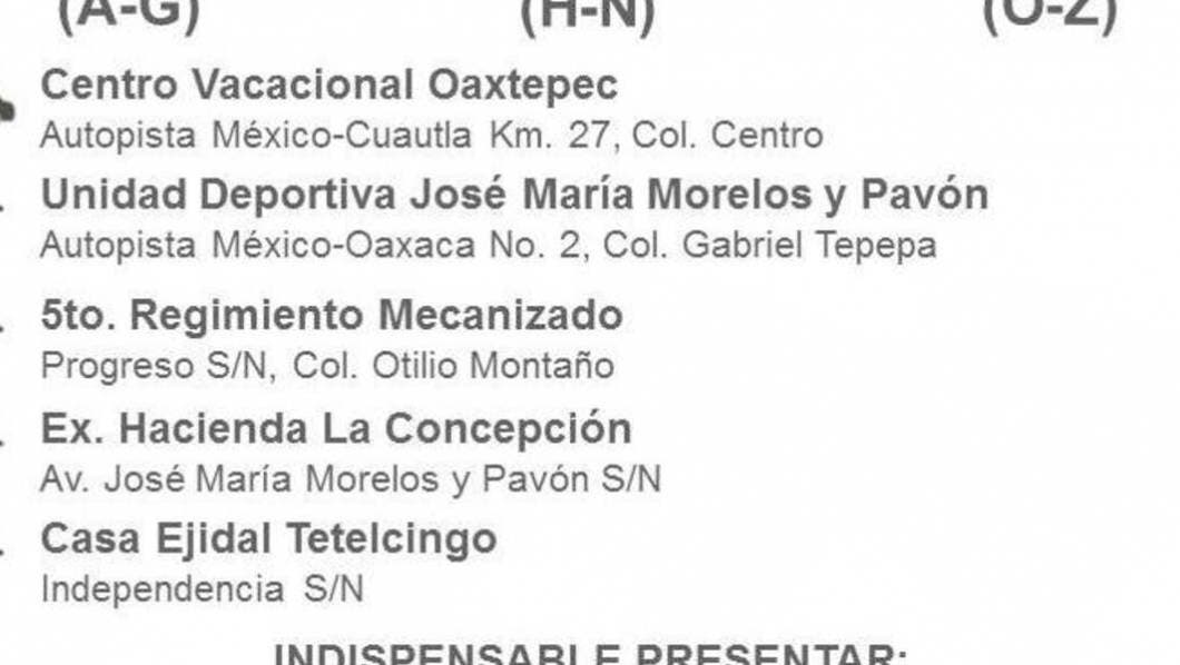 La Brigada Correcaminos que integra la Secretaría de la Defensa Nacional (SEDENA), la Guardia Nacional (GN), la Secretaría de Bienestar, la Secretaría de Salud del estado de Morelos, el Instituto Mexicano del Seguro Social (IMSS) y el Instituto de Seguridad y Servicios Sociales de los Trabajadores del Estado (ISSSTE), informa que es necesario que las personas entre 50 y 59 años de edad presenten la hoja de la primera aplicación de la vacuna, así como una identificación oficial; además, deberán mostrar un comprobante de domicilio para verificar que son residentes de Cuautla, del formato del expediente de vacunación, como requisitos indispensables.