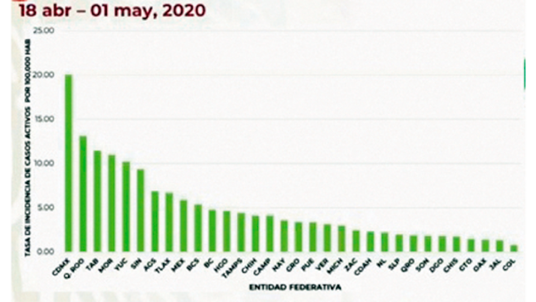 Respecto a Morelos dijo: “Que no había aparecido en las otras gráficas porque tiene una población pequeña, pero en comparacion con su propia poblacion tiene suma de casos que es comparable con las que tienen estados con población diferente”; le siguen Aguacalientes, Yucatán y Sinaloa.
