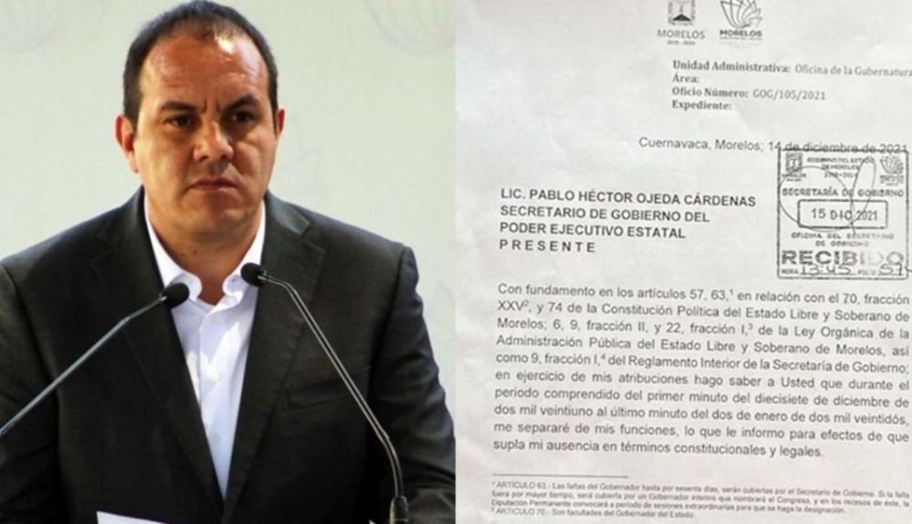 Explica que, mediante oficio del 14 de diciembre de 2021, el Gobernador Cuauhtémoc Blanco, instruyó al secretario de Gobierno, Pablo Ojeda Cárdenas, para suplirlo durante su ausencia temporal, que comprende del del 17 de diciembre del 2021 al 02 de enero del 2022.