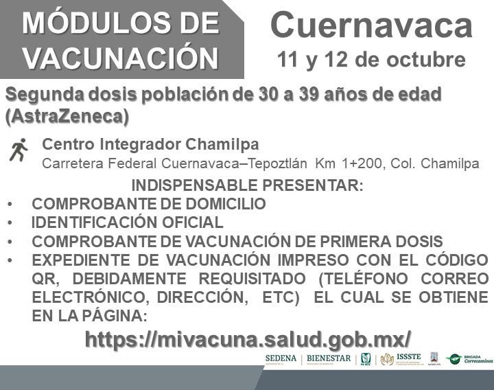 La Brigada Correcaminos en Morelos informa que el lunes 11 y martes 12 de octubre, se llevará a cabo en los municipios de Cuernavaca y Cuautla la aplicación de segundas dosis contra COVID-19 de AstraZeneca para personas de 30 a 39 años de edad; mientras que en Zacualpan de Amilpas se vacunará con segundas dosis de Sinovac a personas de 18 a 29 años.