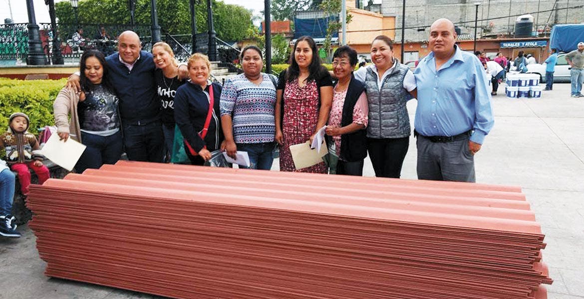 Como parte del programa "Remodelando tu hogar", la subsecretaria de Desarrollo Social Patricia Mireya Martínez, en representación del alcalde de Jiutepec José Manuel Agüero Tovar, entregó 600 láminas de fibrocemento, 50 cubetas de pintura y 50 de impermeabilizante en el zócalo de Tejalpa.