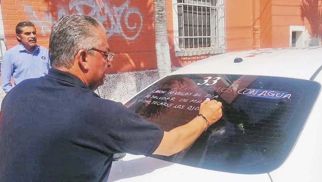 Ayer, en la sede municipal, el personal de la Secretaría de Desarrollo Económico y Turismo, taxistas y personal del Ayuntamiento, colocaron en las unidades del transporte público sin itinerario fijo, las medidas de higiene que se debe tomar respecto al coronavirus COVID-19.