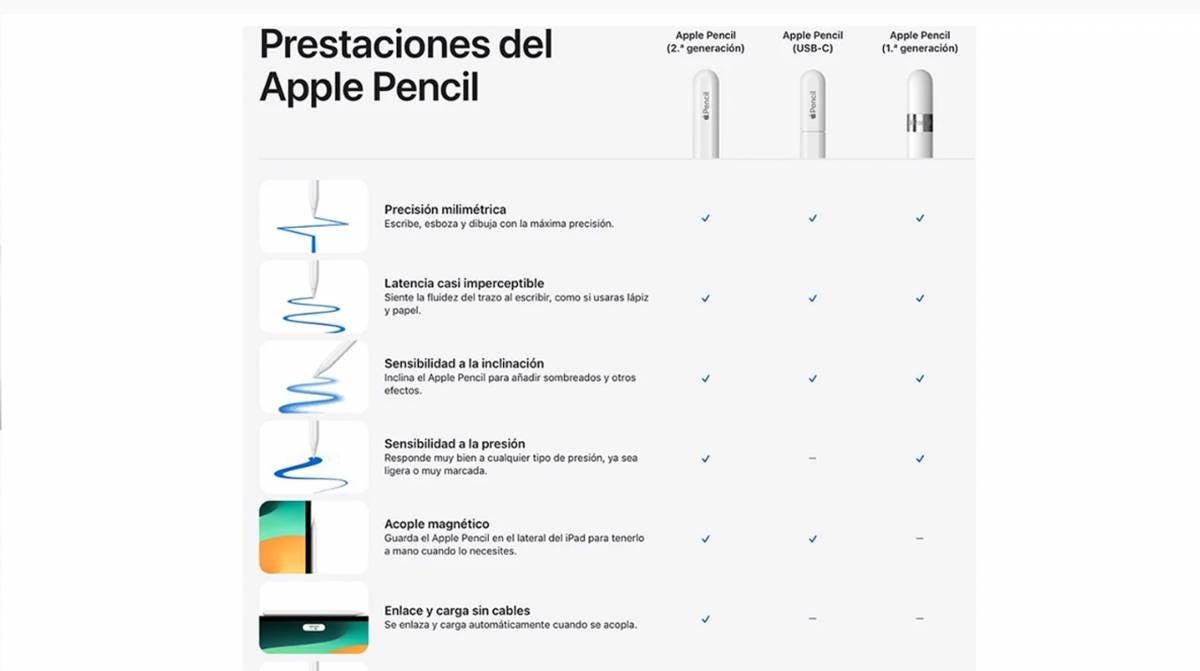 Apple ofrece una comparativa entre los tres modelos de Apple Pencil disponibles en la actualidad, destacando las funciones de cada uno. Este nuevo lanzamiento se posiciona como una opción intermedia, ideal para aquellos que buscan funcionalidad a un precio más accesible.