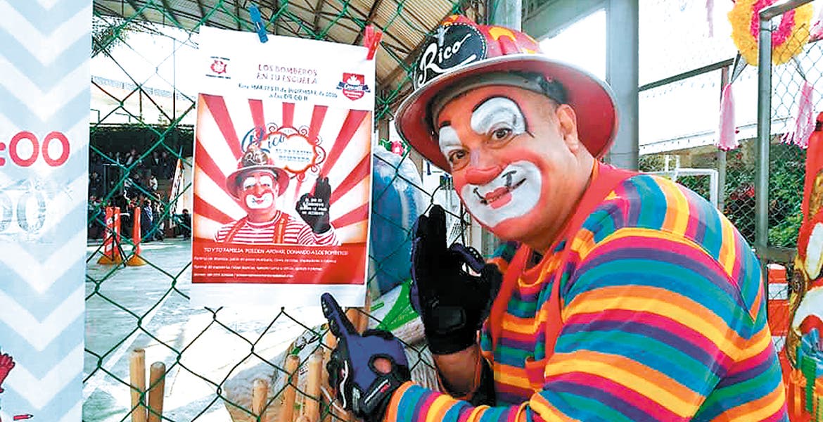 Ricardo Hernández Monroy, quien hace el personaje de “Rico El Payasito Bombero” desde hace 18 años, visita con sus compañeros las escuelas públicas y privadas para que los niños sepan el riesgo de usar fuego.