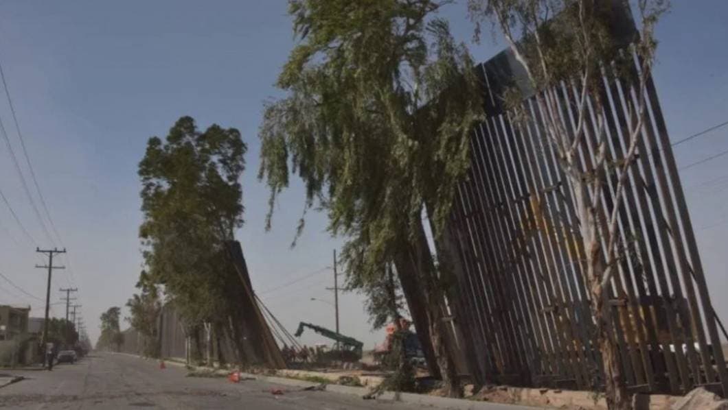 Una familia migrante cruzó hacia el territorio estadounidense, aprovechando el estado de confusión que dejó la caída del muro de Donald Trump, por los fuertes vientos que se presentaron en Mexicali, Baja California.