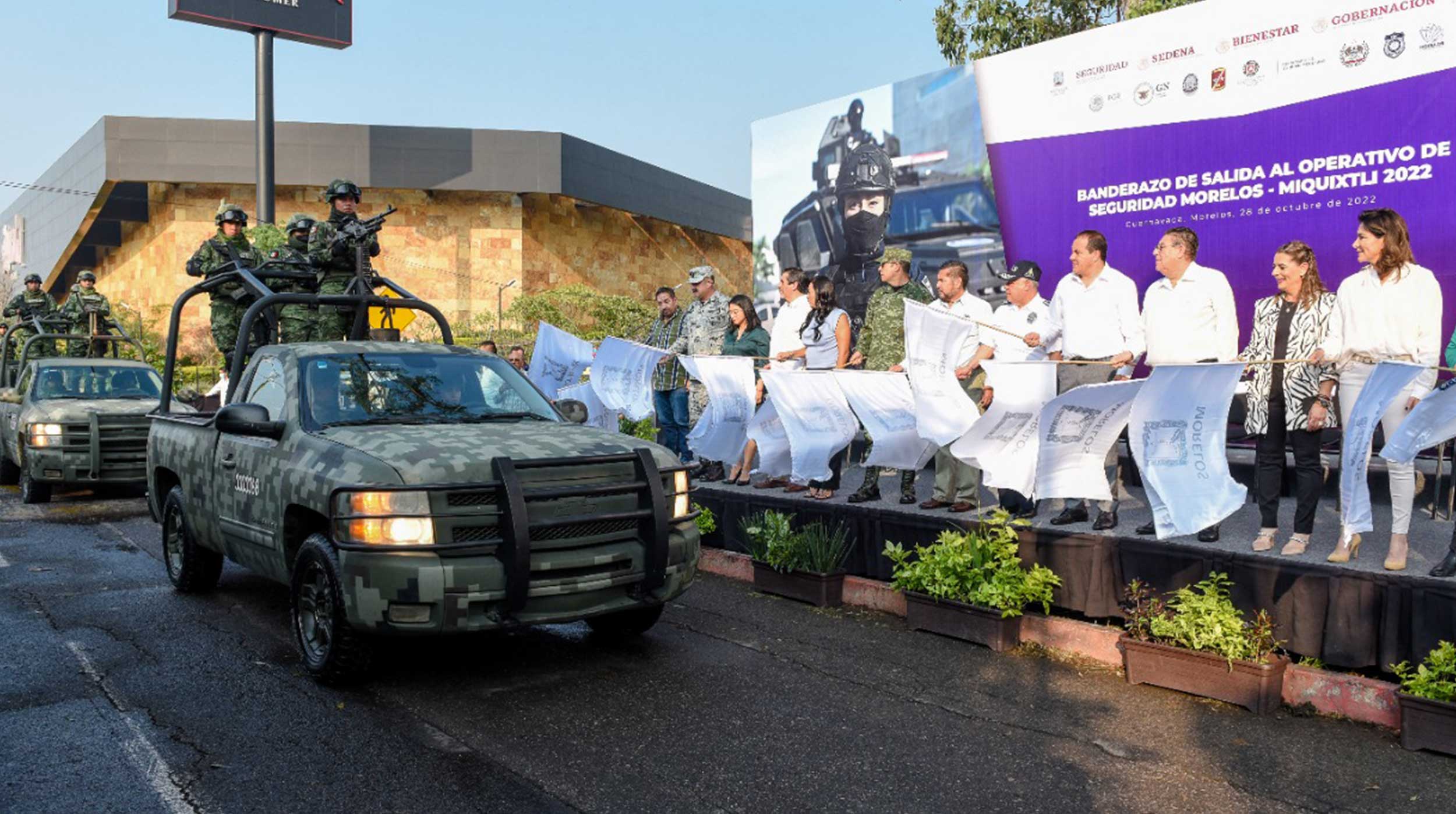 El gobernador Cuauhtémoc Blanco Bravo dio el banderazo de inicio al operativo de seguridad Morelos-Miquixtli 2022; elementos de la Comisión Estatal de Seguridad Pública (CES) se desplegarán por aire y tierra, con la colaboración de autoridades que integran la Mesa de Coordinación Estatal para la Construcción de la Paz, para garantizar la tranquilidad de las familias en la entidad, así como de visitantes y turistas.