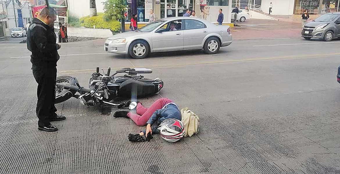 Una motociclista resultó lesionada tras ser arrollada por un Jetta azul, placas PZJ-4379 de Morelos, cuando circulaba por la avenida Morelos Sur casi esquina con calle Veracruz, antes de la glorieta del Niño Artillero en la colonia Las Palmas, en Cuernavaca.
