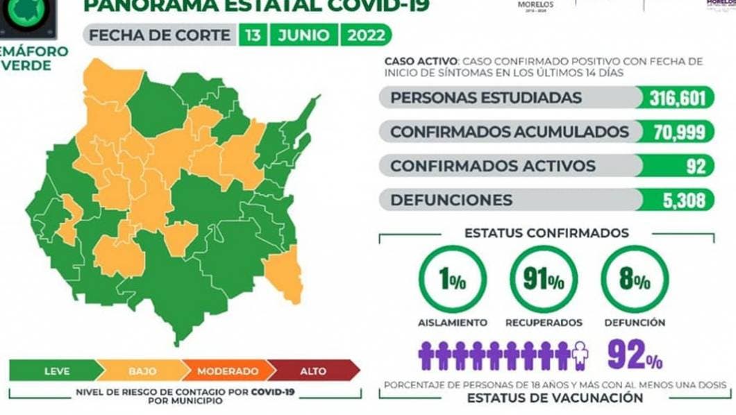 La Secretaría de Salud informa que a la fecha en Morelos se han estudiado 316 mil 601 personas, de las cuales se han confirmado 70 mil 999 con coronavirus COVID-19; 92 están activas y se han registrado 5 mil 308 defunciones.