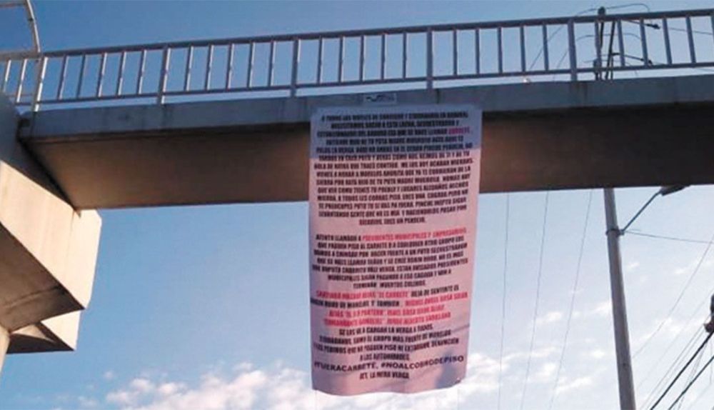 Una narcomanta con amenazas en contra del líder de Santiago Mazari, “El Carrete”, líder del cártel de “Los Rojos”, así como en contra de los alcaldes que lo apoyen o le paguen “derecho de piso”, fue asegurada por policías estatales, tras ser colocada y abandonada en el puente peatonal de la colonia Satélite, en Cuernavaca.