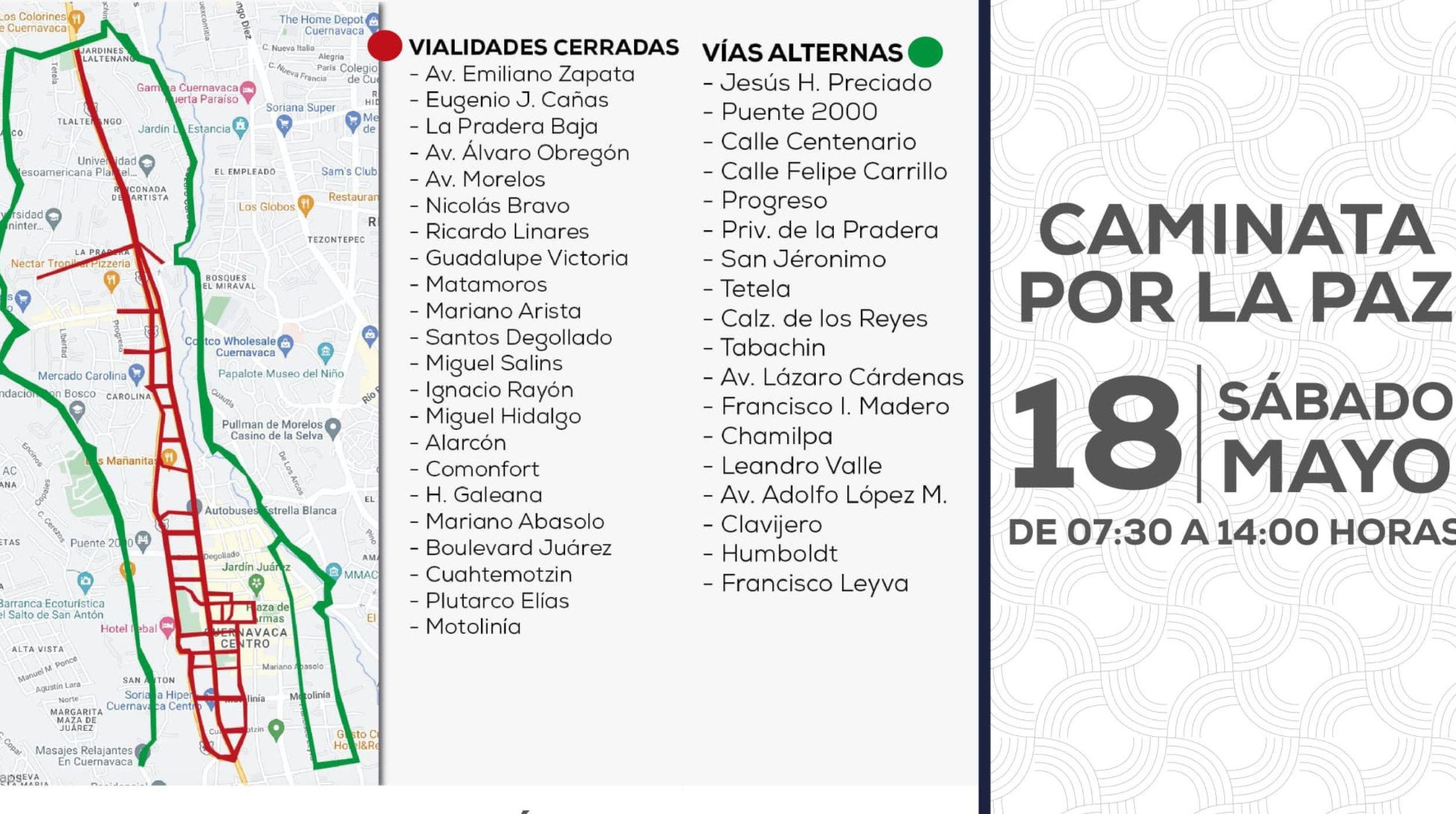 La Caminata por la Paz, que se llevará a cabo este sábado 18 de mayo, ocasionará el cierre de al menos 20 vialidades enCuernavaca. Los cierres iniciarán a las 7:30 horas en la avenida Emiliano Zapata, a la altura de la Glorieta de Tlaltenango, y se irán extendiendo conforme avance el contingente.