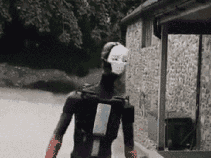 Como si se tratara de la película "Yo, Robot" de Will Smith, la máquina provista de una máscara sin facciones se desplaza con total normalidad por el estacionamiento de una zona residencial y hace gestos como una persona.