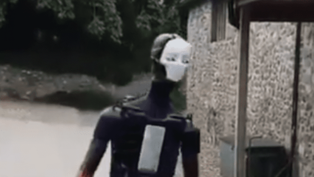 Como si se tratara de la película "Yo, Robot" de Will Smith, la máquina provista de una máscara sin facciones se desplaza con total normalidad por el estacionamiento de una zona residencial y hace gestos como una persona.