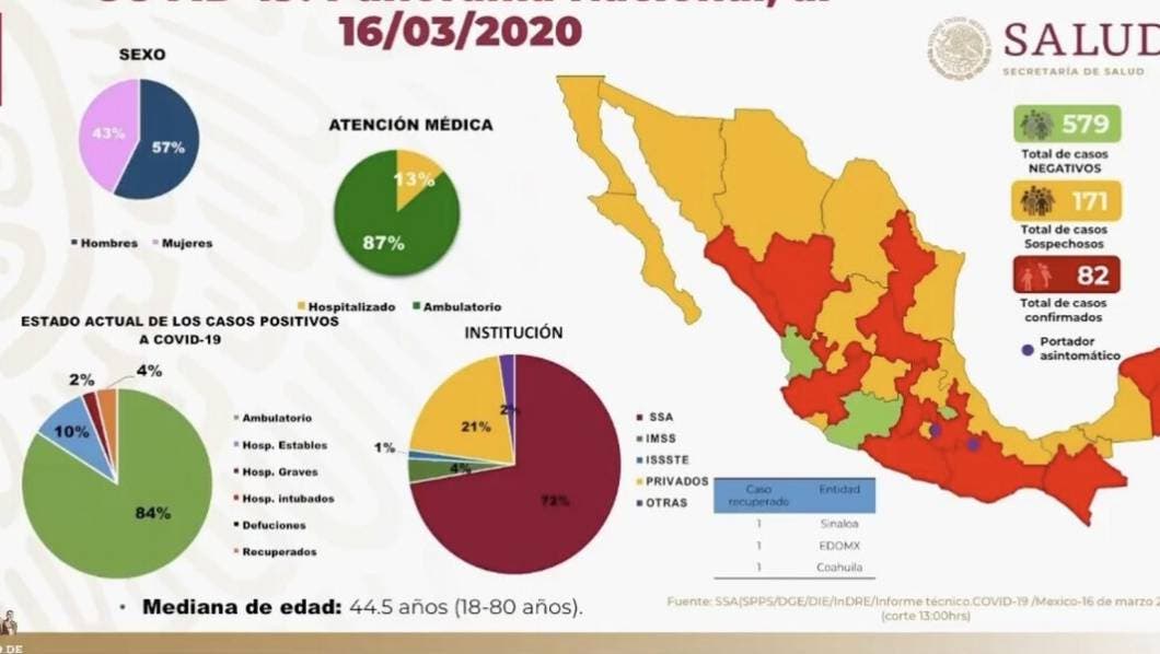 Autoridades de la Secretaría de Salud federal (Ssa) informaron en conferencia de prensa que el número de casos confirmados de la nueva cepa de coronavirus (Covid-19) subió a 82 en México, de los cuales 43% son mujeres y el 57% son hombres.