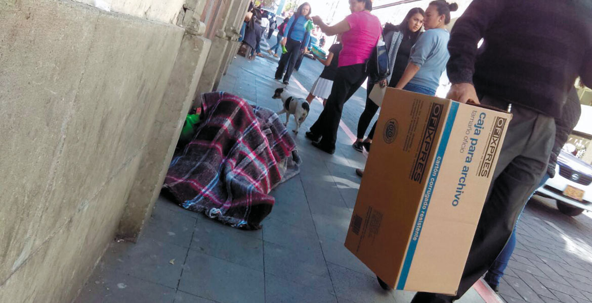 Riesgo. En céntricas calles, peatones pasan junto a un indigente que yace en una de las banquetas.