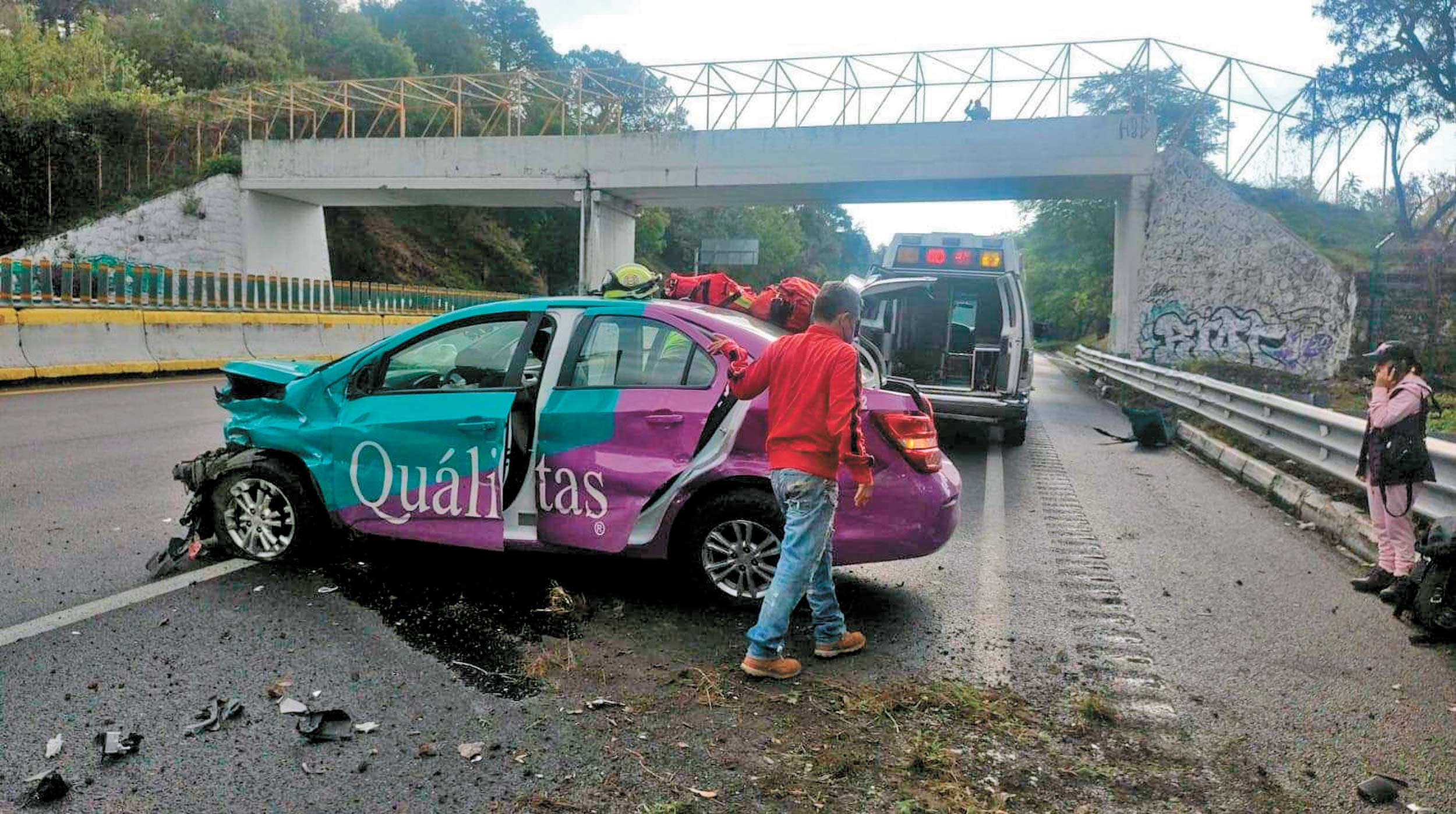 Cuernavaca.- El pavimento mojado y el posible exceso de velocidad, fue la causa por la que un auto de una empresa de seguros se impactó contra los muros de contención de la autopista Cuernavaca-México.