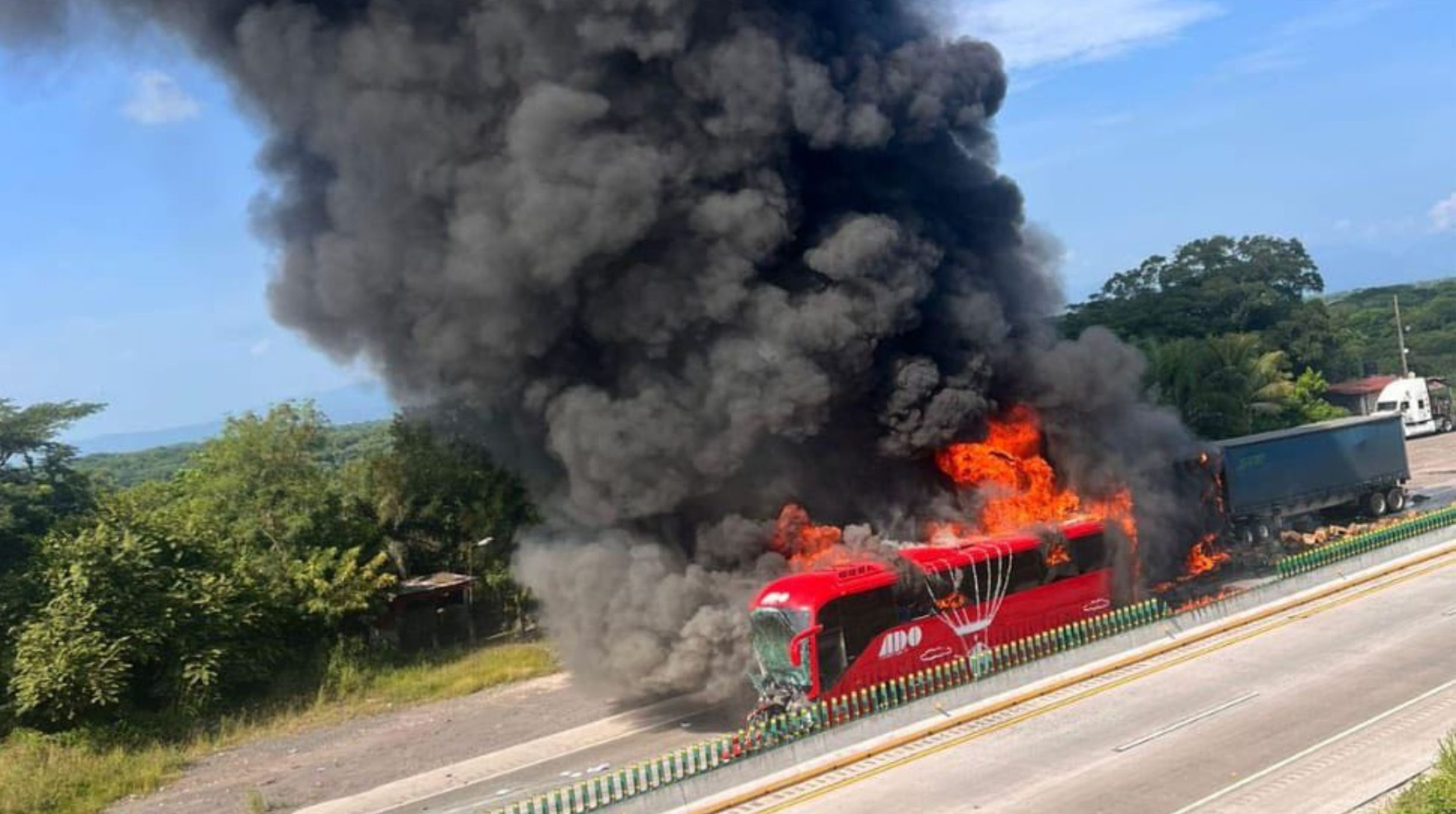 Videos captados por conductores y pobladores locales, difundidos en redes sociales, muestran llamas de hasta varios metros de altura envolviendo la carrocería del ADO, mientras el tráiler comenzaba a arder en su remolque.