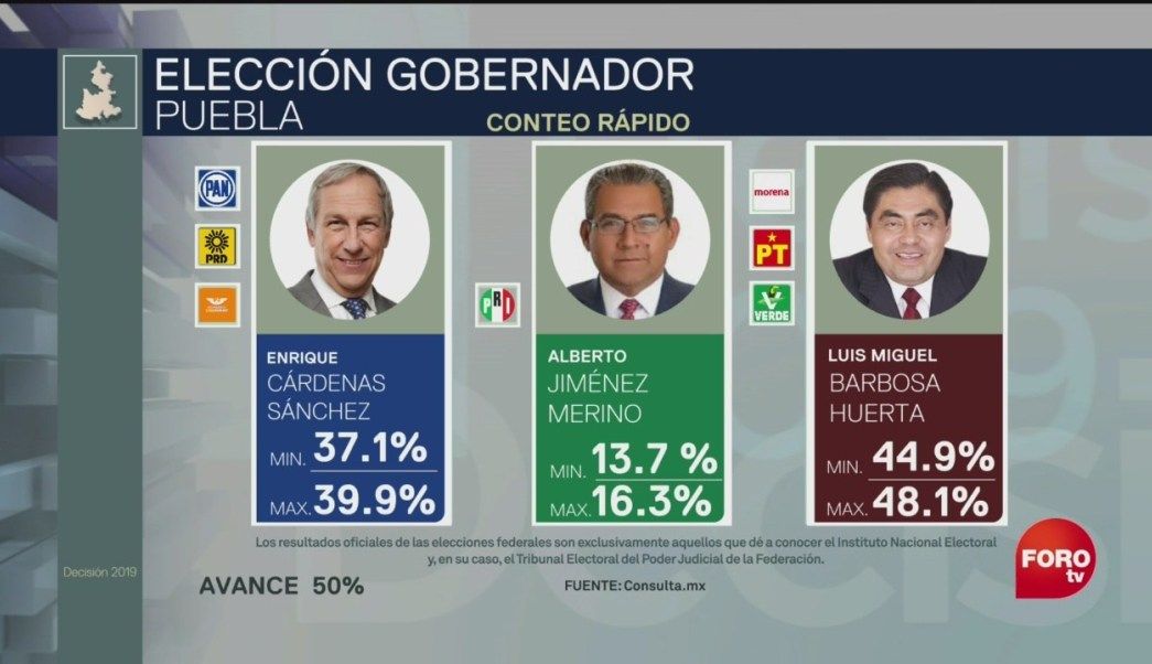 Los datos de las autoridades electorales destacan que Barbosa Huerta tendría un mínimo de los votos de 44.9% y un máximo de 48.1%; Enrique Cárdenas Sánchez, abanderado del Partido Acción Nacional (PAN), Movimiento Ciudadano (MC), y Partido de la Revolución Democrática (PRD), un mínimo de 37.1% y un máximo de 39.9%, y el priista Alberto Jiménez Merino, un mínimo de 13.7% y un máximo de 16.3%, de acuerdo al conteo rápido con un avance de 50%.