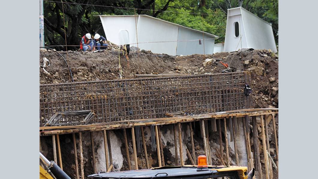 Las gráficas muestran los trabajos para levantar el nuevo puente Chamilpa, sobre la autopista Cuernavaca-Acapulco, en las obras del Paso Express; las estructuras denominadas ballenas ya se encuentran listas para ser instaladas, al mismo tiempo la armazón de las trabes avanza al pie del puente vehicular.