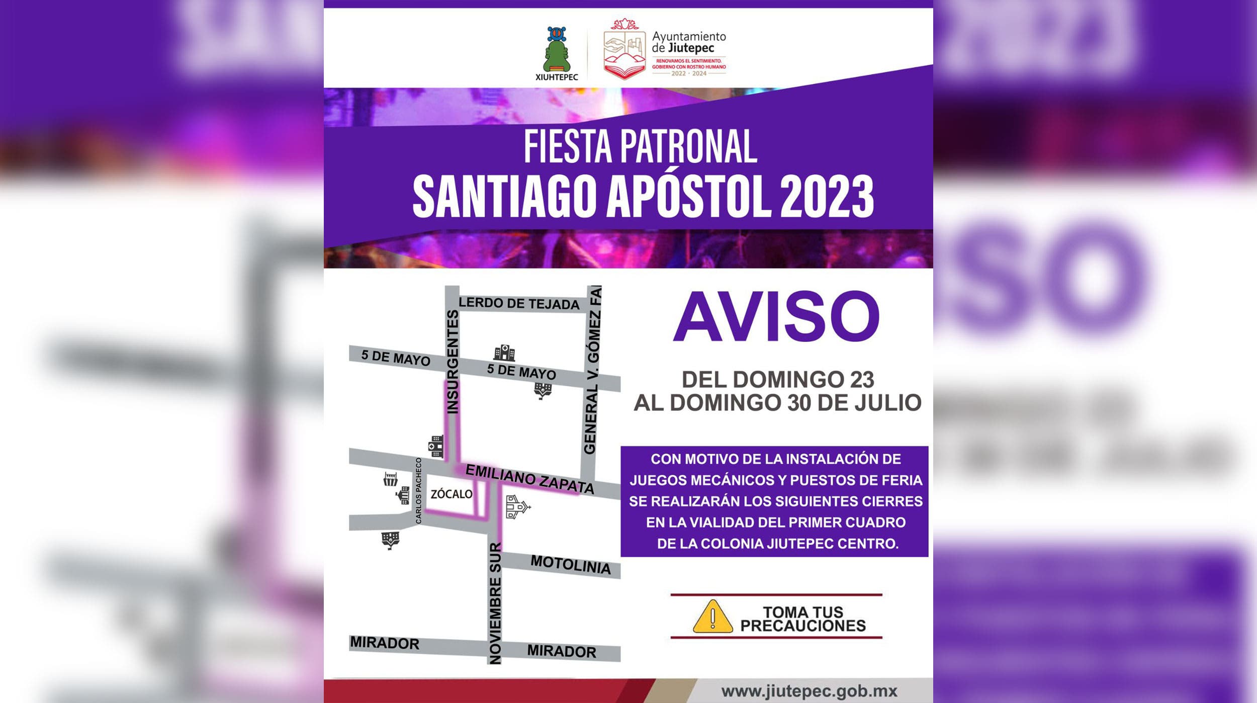 El Gobierno de Jiutepec alertó a la población del próximo cierre de calles en el primer cuadro con motivo de la fiesta patronal en honor a Santiago Apóstol, para que lo tengan presente y tomen sus precauciones.