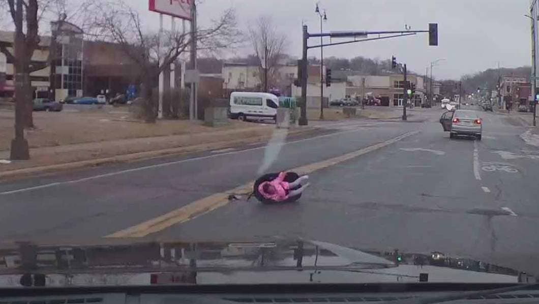 Chad Cheddar Mock conducía en la calle Minnesota el lunes por la mañana, cuando un asiento para el automóvil que sostenía a un niño pequeño cayó por la puerta trasera del auto frente a él.