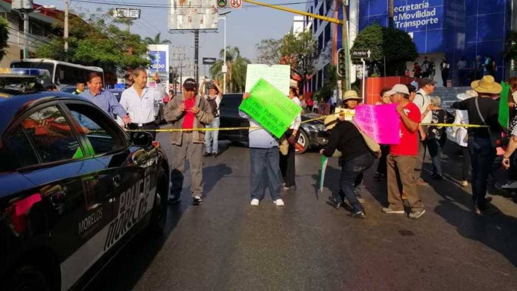 Esta mañana, jubilados del Cobaem y administrativos bloquean la avenida Plan de Ayala, a la altura de la Plaza Arcos Cristal, en demanda de pagos.