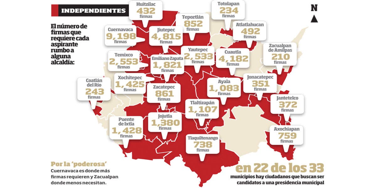 Para las presidencias municipales, en Cuernavaca, los aspirantes a la candidatura necesitan 9 mil 198 firmas, mientras que en Zacualpan de Amilpas necesitan 210.