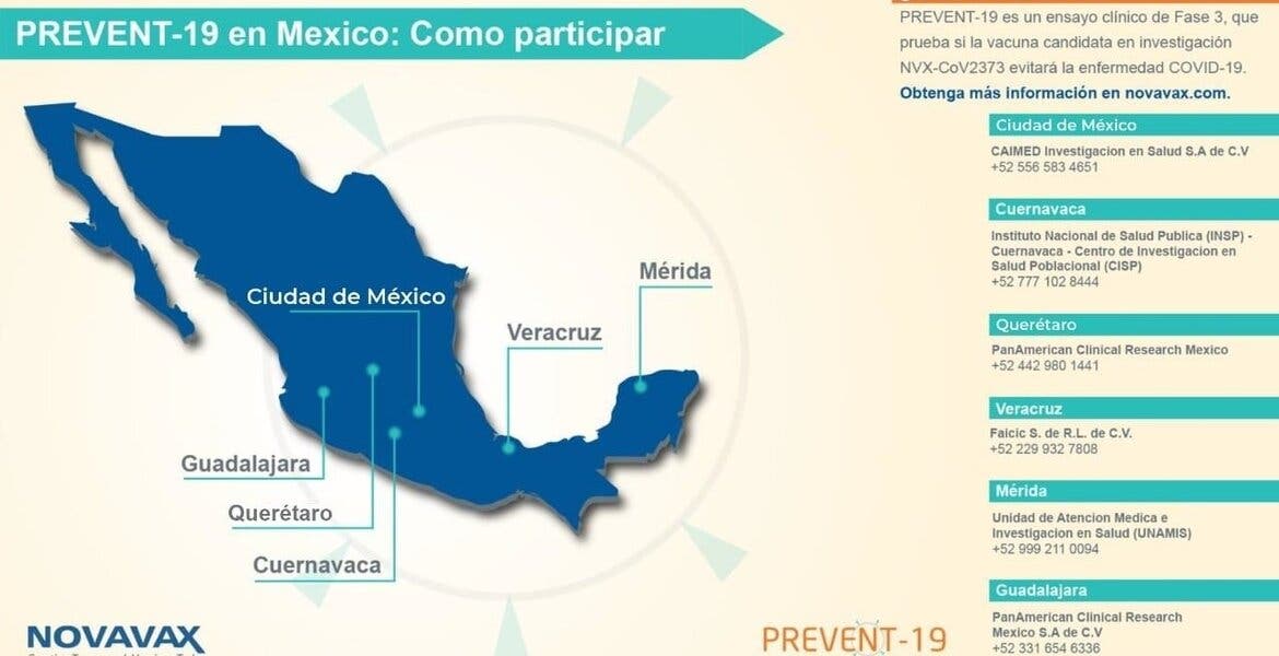 Los centros de México serán 7: Ciudad de México en CAIMED investigación de Salud S.A.; dos en Cuernavaca, en el Centro de Investigación en Salud Poblacional e Instituto Nacional de Salud Publica, Querétaro en PanAmerican Clinica Research Mexico; Veracruz en Faicic S. de R.L. de C.V.; Mérida, en Unidad de Atención Medica e Investigación en Salud y 6; Guadalajara en PanAmerican Clinical Research Mexico S.A de C.V.