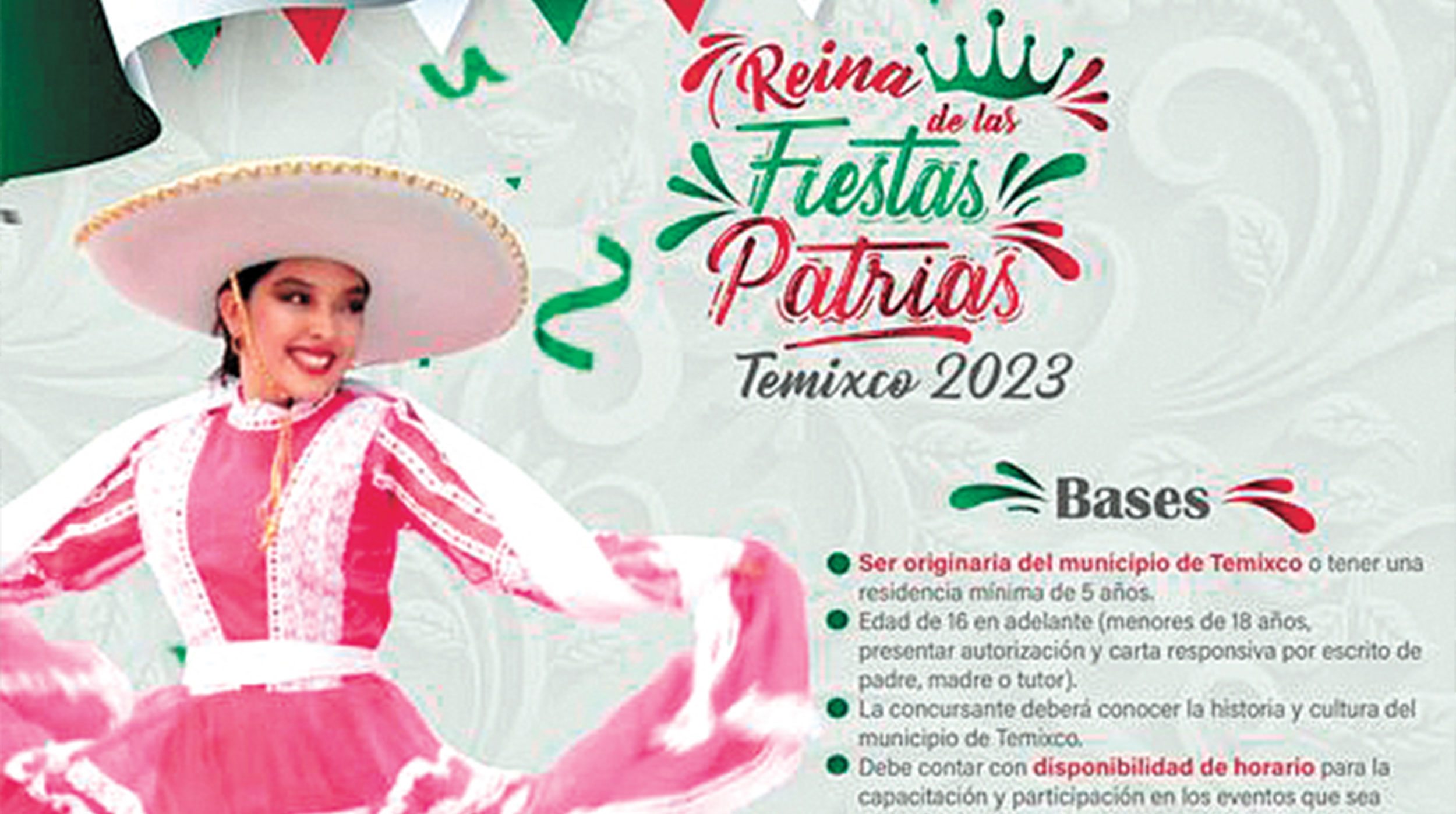 Autoridades municipales de Temixco, encabezadas por Juanita Ocampo Domínguez, comenzaron los preparativos para las “Fiestas Patrias Temixco 2023”; por ello, invitan a mujeres originarias del municipio, o tener una residencia mínima de cinco años, para participar para la coronación de la Reina de las Fiestas Patrias.