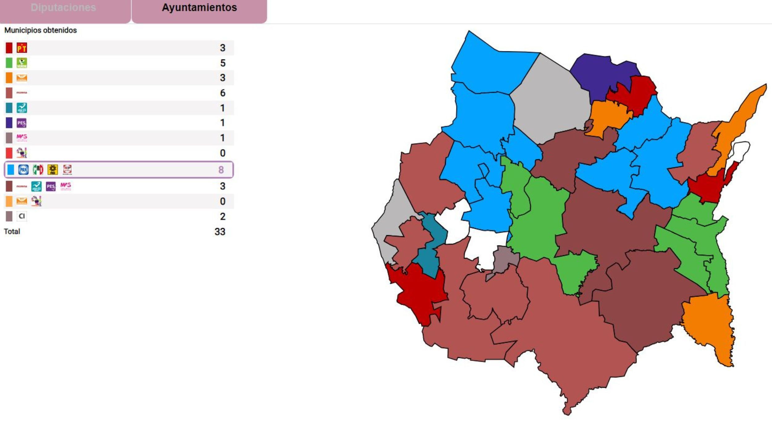 Basado en las cifras más recientes del PREP en Morelos, con un avance del 88.16% de casillas computadas al corte de esta tarde, la distribución de ayuntamientos tras la elección de este domingo 2 de junio sería la siguiente: la coalición PAN-PRI-PRD-RSP obtendría 8, el PVEM 5, Morena 6, la coalición Morena-Nueva Alianza-PES-MAS 3, Movimiento Ciudadano 3, el PT 3, candidaturas independientes 2, y una alcaldía cada uno para Nueva Alianza, PES y MAS.